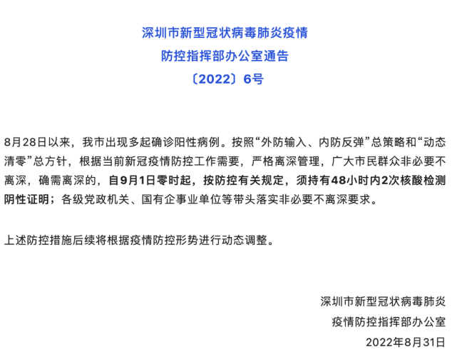 自9月1日零時起,按防控有關規(guī)定,須持有48小時內(nèi)2次核酸檢測陰性證明(即兩天兩檢)。