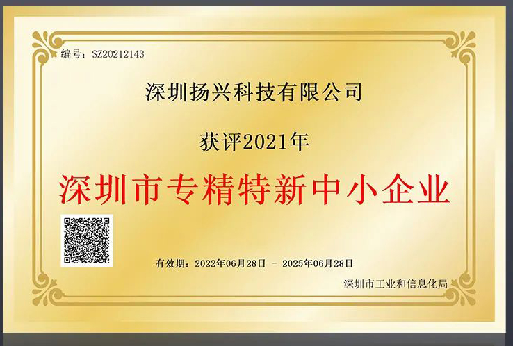 近日,深圳揚興科技有限公司成功入選工信局2021年度深圳市專精特新中小企業(yè)名單,獲評“專精特新”榮譽稱號。