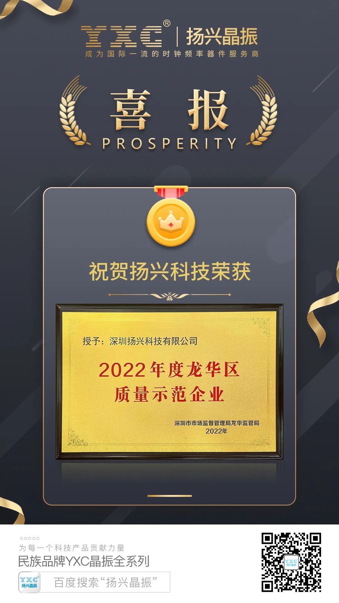 喜訊!2023年2月23日深圳市揚(yáng)興科技有限公司(YXC)榮獲“2022年度龍華區(qū)質(zhì)量示范企業(yè)”稱號(hào)。