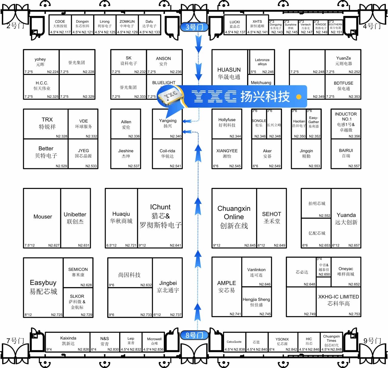 從N2館3號(hào)門或8號(hào)門進(jìn)入,沿主通道直行,即可抵達(dá)YXC揚(yáng)興科技展位