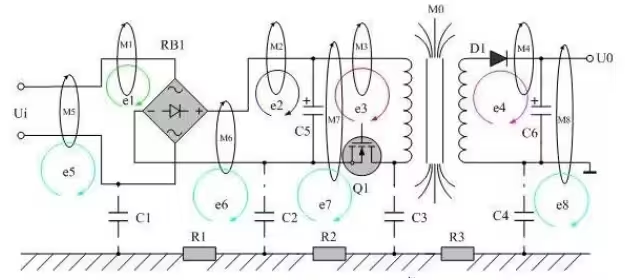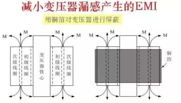 對(duì)變壓器進(jìn)行磁屏蔽、盡量減少每個(gè)電流回路的有效面積,圖中的電磁感應(yīng)干擾,最為嚴(yán)重的是變壓器漏感所產(chǎn)生。若將變壓器的漏感視為變壓器感應(yīng)線(xiàn)圈的初級(jí),則其它回路可視為是變壓器的次級(jí),所以在變壓器周?chē)幕芈分?,都?huì)被感應(yīng)產(chǎn)生干擾信號(hào)。減少干擾的方法,一是對(duì)變壓器進(jìn)行磁屏蔽,二是盡量減少每個(gè)電流回路的有效面積。