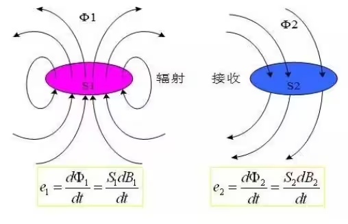 e1、 Φ1、S1、B1分別為輻射電流回路中產(chǎn)生的電動(dòng)勢(shì)、磁通、面積、磁通密度;e2、 Φ2、S2、B2分別為輻射電流回路中產(chǎn)生的電動(dòng)勢(shì)、磁通、面積、磁通密度。