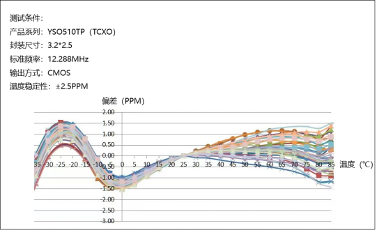 YSO510TP為通用系列TCXO。可選頻率范圍為10~52MHz、尺寸最小可達(dá)2.0 x 1.6mm、具備CMOS與Clipped sine wave兩種輸出方式。在-30~85℃的工作溫度范圍內(nèi),溫度穩(wěn)定性(典型值±2.5PPM,最小值±0.28PPM)。以下為產(chǎn)品實(shí)測數(shù)據(jù):