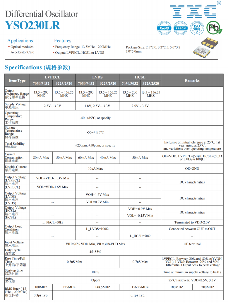 YSO230LR差分晶振具有廣泛的頻率范圍。作為一款高頻差分石英晶體振蕩器,YSO230LR支持13.5MHz-200MHz的寬頻率范圍。并且,該產(chǎn)品系列的總頻差在±50PPM以內(nèi),保證了高精度的輸出信號。不論您的應(yīng)用需要何種頻率,YSO230LR差分晶振都能夠滿足您的需求。